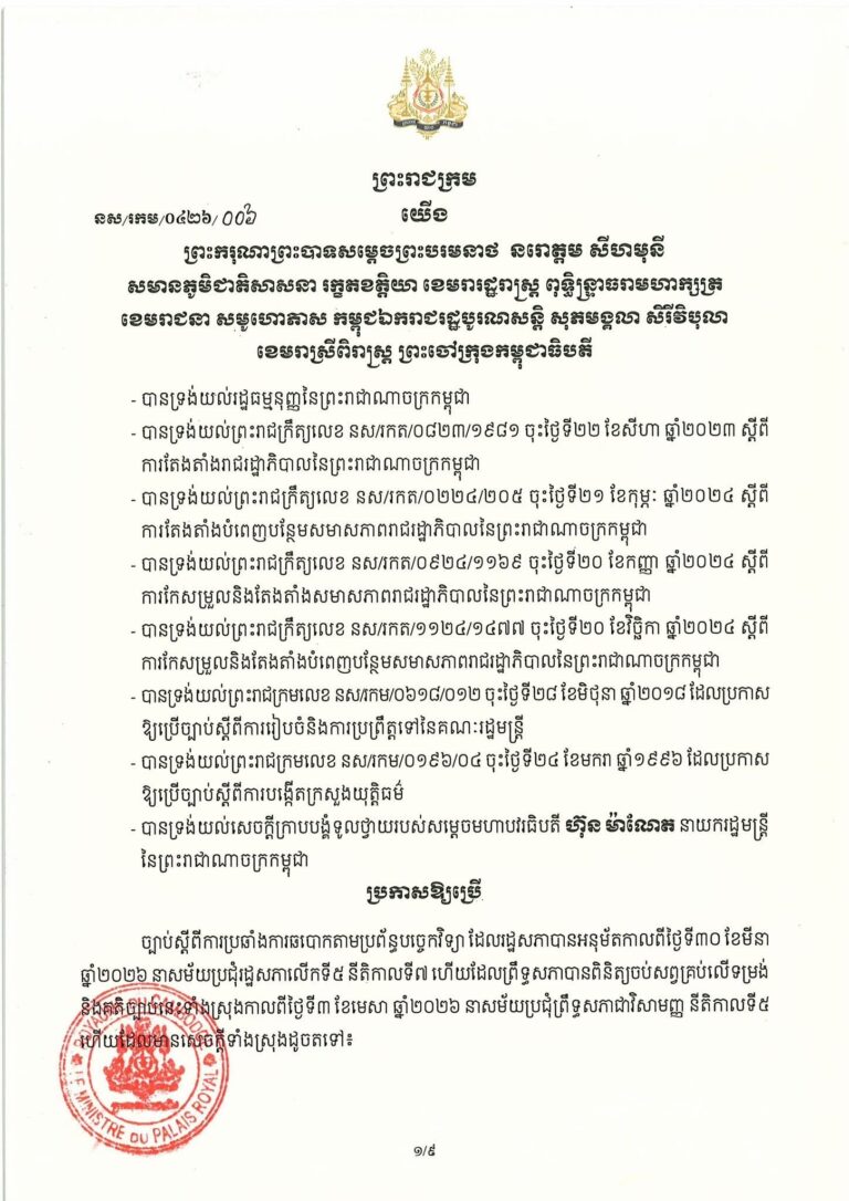 (ភ្នំពេញ)៖ សម្តេចតេជោ ហ៊ុន សែន ប្រមុខរដ្ឋស្តីទី នៅថ្ងៃទី០៦ ខែមេសា ឆ្នាំ២០២៦ បានចេញព្រះរាជក្រម ប្រកាសឱ្យប្រើច្បាប់ស្តីពីការប្រឆាំងការឆបោកតាមប្រព័ន្ធបច្ចេកវិទ្យា ដែលរដ្ឋសភាបានអនុម័តកាលពីថ្ងៃទី៣០ ខែមីនា ឆ្នាំ២០២៦ នាសម័យប្រជុំរដ្ឋសភាលើកទី៥ នីតិកាលទី៧ ហើយដែលព្រឹទ្ធសភាបានពិនិត្យចប់សព្វគ្រប់លើទម្រង់ និងគតិ ច្បាប់នេះទាំងស្រុងកាលពីថ្ងៃទី៣ ខែមេសា ឆ្នាំ២០២៦…