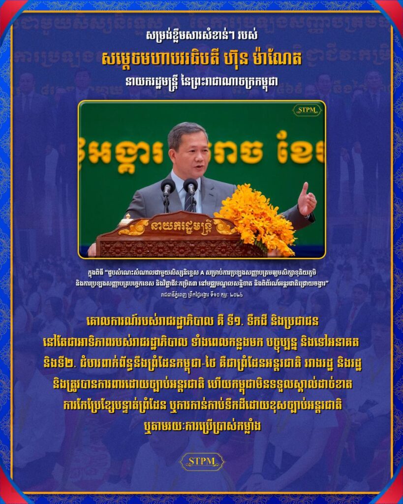 សម្តេចមហាបវរធិបតី ហ៊ុន ម៉ាណែត នាយករដ្ឋមន្រ្តី នៃព្រះរាជាណាចក្រកម្ពុជា បានថ្លែងក្នុងពិធីសំណេះសំណាលជាមួយសិស្សជាប់និទ្ទេស A សម្រាប់ការប្រឡងសញ្ញាបត្រមធ្យមសិក្សាទុតិយភូមិ និង ការប្រឡងសញ្ញាបត្របច្ចេកទេស និង វិជ្ជាជីវៈ កម្រិត៣ នៅព្រឹកថ្ងៃទី ១០ ខែ កុម្ភៈ ឆ្នាំ ២០២៦ ថា គោលការណ៍របស់រាជរដ្ឋាភិបាល គឺ ទី១. ទឹកដី និងប្រជាជន នៅតែជាអាទិភាពរបស់រាជរដ្ឋាភិបាល ទាំងពេលកន្លងមក បច្ចុប្បន្ន និងទៅអនាគត និង ទី២. ជំហរពាក់ព័ន្ធនឹងព្រំដែនកម្ពុជា-ថៃ គឺជាព្រំដែនអន្តរជាតិ រវាងរដ្ឋ និងរដ្ឋ និងត្រូវបានការពារដោយច្បាប់អន្តរជាតិ ជាពិសេសធម្មនុញ្ញរបស់អង្គការសហប្រជាជាតិ។ ហេតុដូចនេះ, កម្ពុជាប្រកាន់ជំហរដាច់ខាត ក្នុងការការពារអធិបតេយ្យជាតិ និងបូរណភាពទឹកដី ទាំងបច្ចុប្បន្ន ទាំងទៅអនាគត ដោយប្រើប្រាស់គ្រប់មធ្យោបាយដែលកម្ពុជាមាន ស្របតាមច្បាប់អន្តរជាតិ ហើយកម្ពុជាមិនទទួលស្គាល់ដាច់ខាតការកែប្រែខ្សែបន្ទាត់ព្រំដែន ឬការកាន់កាប់ទឹកដីដោយខុសច្បាប់អន្តរជាតិ ឬ តាមរយៈការប្រើប្រាស់កម្លាំង។ បន្ថែមពីនេះ, កម្ពុជាប្រកាន់ខ្ជាប់នូវការដោះស្រាយបញ្ហាព្រំដែនកម្ពុជា-ថៃ ដោយសន្តិវិធី ស្របតាមច្បាប់អន្តរជាតិ ព្រមទាំងកិច្ចព្រមព្រៀងដែលមានស្រាប់ដែលកម្ពុជា និងថៃ បានចុះហត្ថលេខាជាមួយគ្នា ជាពិសេសការចុះវាស់វែងតាមយន្ដការគណៈកម្មការចម្រុះ ខណ្ឌសីមាព្រំដែនគោក (JBC) ដើម្បីកំណត់ភាពត្រឹមត្រូវ និងយុត្តិធម៌របស់ប្រទេសទាំងពីរក្នុងការការពារអធិបតេយ្យភាព និងបូរណភាពទឹកដីរៀងៗខ្លួន ។ ជាមួយគ្នានេះ, សម្ដេចបវរធិបតី នាយករដ្ឋមន្ត្រី បានគូសបញ្ជាក់ថា ការពង្រឹងគុណភាពវិស័យអប់រំកម្ពុជា គឺជាគោលដៅឤទិភាពរបស់រាជរដ្ឋាភិបាល ដែលបានកំណត់ក្នុងយុទ្ធសាស្ត្របញ្ចកោណ សម្រាប់អនុវត្តនៅគ្រប់ដំណាក់កាល, គឺការអប់រំឱ្យមានចំណេះដឹងទូលាយ ជំនាញពិតប្រាកដ ព្រមទាំង សីលធម៌ គុណភាព និង មនសិការស្នេហាជាតិ, ជាពិសេស ការបណ្តុះបណ្តាលជំនាញបច្ចេកទេស វិទ្យាសាស្ត្រ និង បច្ចេកវិទ្យា, ការតម្រង់ទិសសម្រាប់ទីផ្សារការងារ និងការពង្រឹងជំនាញបច្ចេកទេសដល់យុវជន សំដៅធានាថា «យុវជនម្នាក់មានជំនាញមួយយ៉ាងតិចប្រចាំជីវិត» ដើម្បីលើកស្ទួយជីវភាពគ្រួសារឱ្យកាន់តែល្អប្រសើរ និងរួមចំណែកក្នុងកាអភិវឌ្ឍសង្គម-សេដ្ឋកិច្ចជាតិ ។ ជាមួយនេះ, ការងារអភិវឌ្ឍធនធានមនុស្សកម្ពុជា ពិតជាមានមោទនភាពខ្ពស់ នៅពេលដែលវិស័យអប់រំរបស់ខ្លួន ទទួលបាននូវការរីកចម្រើន ទាំងបរិមាណ និង គុណភាព ព្រោះអនាគតរបស់ប្រទេសជាតិ គឺភ្ជាប់ជាមួយអនាគតរបស់យុវជន។ ដើម្បីចូលរួមជំរុញការអនុវត្តគោលការណ៍ «អ្នកចេះគឺជាប់» និង ការបង្កើនបរិមាណសិស្សជាប់និទ្ទេស A, សូមផ្តល់អនុសាសន៍មួយចំនួនដល់ថ្នាក