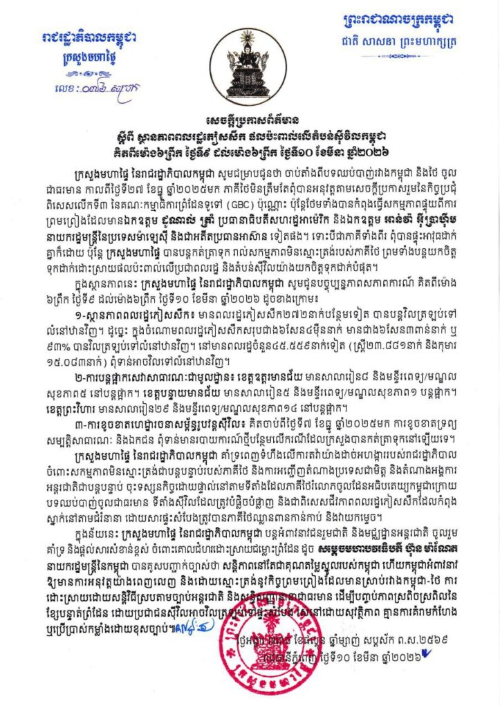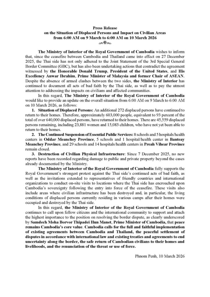 (ភ្នំពេញ)៖ ក្រសួងមហាផ្ទៃ នៅថ្ងៃទី១០ ខែមីនា ឆ្នាំ២០២៦នេះ បានឲ្យដឹងថា គិតចាប់ពីម៉ោង ៦ព្រឹក ថ្ងៃទី០៩ ដល់ម៉ោង៦ព្រឹក ថ្ងៃទី១០ ខែមីនា ឆ្នាំ២០២៦នេះ មានប្រជាពលរដ្ឋភៀសសឹក ២៧២នាក់បន្ថែមទៀត បានវិលត្រឡប់ទៅលំនៅឋានវិញ។ ដូច្នេះក្នុងចំណោមពលរដ្ឋភៀសសឹកសរុបជាង៦សែន ៤ម៉ឺននាក់ មានជាង ៦សែន ៣ពាន់នាក់ ស្មើ ៩៣ភាគរយ បានវិលត្រឡប់ទៅលំនៅឋានវិញ។ ពលរដ្ឋភៀសសឹកបន្តស្នាក់នៅជំរំមានចំនួន ៤៥ ៥៥៩នាក់ទៀត (ស្រី្ត ២៣.៨៨១នាក់ និងកុមារ ១៥.០៨៣នាក់) ពុំទាន់អាចវិលទៅលំនៅឋានវិញ។ ការភៀសសឹកទ្រង់ទ្រាយធំបែបនេះ បានធ្វើឲ្យប៉ះពាល់យ៉ាងធ្ងន់ធ្ងរ ទាំងផ្នែកមុខរបរ សុខុមាលភាព សាធារណៈ សិទ្ធិលំនៅឋាន ជាពិសេសសិទ្ធិទទួលបានការសិក្សារបស់កុមារ និងប៉ះទង្គិចផ្លូវចិត្តដ៏គួរឲ្យព្រួយបារម្ភ។ ជាងនេះទៅទៀត ពលរដ្ឋភៀសសឹកខ្លះ វិលដល់ភូមិករមែន ប៉ុន្តែត្រូវបង្ខំចិត្តស្នាក់នៅក្នុងជំរុំបណ្ដោះអាសន្នជាថ្មីទៀត ដោយសារផ្ទះសំបែងបានខូចខាតខ្ទេចរាបដល់ដី និងពោរពេញដោយសំណល់យុទ្ធភណ្ឌមិនទាន់ផ្ទុះរបស់យោធាថៃ៕ ខាងក្រោមនេះ ជាសេចក្ដីប្រកាសព័ត៌មានរបស់ក្រសួងមហាផ្ទៃ៖