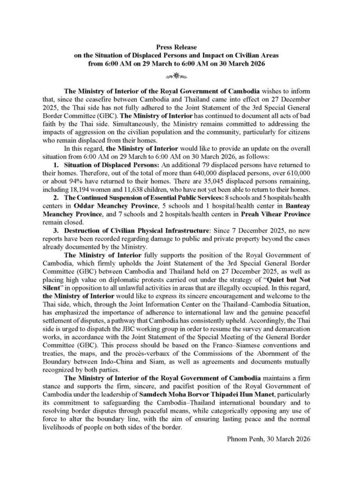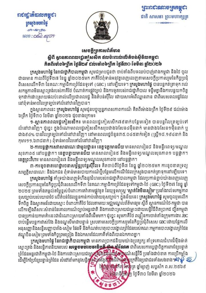 (ភ្នំពេញ)៖ ក្រសួងមហាផ្ទៃ នៅថ្ងៃទី៣០ ខែមីនា ឆ្នាំ២០២៦នេះ បានឲ្យដឹងថា គិតចាប់ពីម៉ោង ៦ព្រឹក ថ្ងៃទី២៩ ដល់ម៉ោង៦ព្រឹក ថ្ងៃទី៣០ ខែមីនា ឆ្នាំ២០២៦នេះ មានប្រជាពលរដ្ឋភៀសសឹក ៧៩នាក់បន្ថែមទៀត បានវិលត្រឡប់ទៅលំនៅឋានវិញ។ ដូច្នេះក្នុងចំណោមពលរដ្ឋភៀសសឹក សរុបជាង៦សែន ៤ម៉ឺននាក់ មានជាង ៦សែន ១ម៉ឺននាក់ ស្មើជាង ៩៤ភាគរយ បានវិលត្រឡប់ទៅលំនៅឋានវិញ។ ពលរដ្ឋភៀសសឹកបន្តស្នាក់នៅជំរំមានចំនួន ៣៥ ០៤៥នាក់ទៀត (ស្រី្ត ១៨.១៩៤នាក់ និងកុមារ ១១.៦៣៨នាក់) ពុំទាន់អាចវិលទៅលំនៅឋានវិញ។ ការភៀសសឹកទ្រង់ទ្រាយធំបែបនេះ បានធ្វើឲ្យប៉ះពាល់យ៉ាងធ្ងន់ធ្ងរ ទាំងផ្នែកមុខរបរ សុខុមាលភាព សាធារណៈ សិទ្ធិលំនៅឋាន ជាពិសេសសិទ្ធិទទួលបានការសិក្សារបស់កុមារ និងប៉ះទង្គិចផ្លូវចិត្តដ៏គួរឲ្យព្រួយបារម្ភ។ ជាងនេះទៅទៀតពលរដ្ឋភៀសសឹកខ្លះ វិលដល់ភូមិករមែន ប៉ុន្តែត្រូវបង្ខំចិត្តស្នាក់នៅក្នុងជំរុំបណ្ដោះអាសន្នជាថ្មីទៀត ដោយសារផ្ទះសំបែងបានខូចខាតខ្ទេចរាបដល់ដី និងពោរពេញដោយសំណល់យុទ្ធភណ្ឌមិនទាន់ផ្ទុះរបស់យោធាថៃ៕ ខាងក្រោមនេះ ជាសេចក្ដីប្រកាសព័ត៌មានរបស់ក្រសួងមហាផ្ទៃ៖